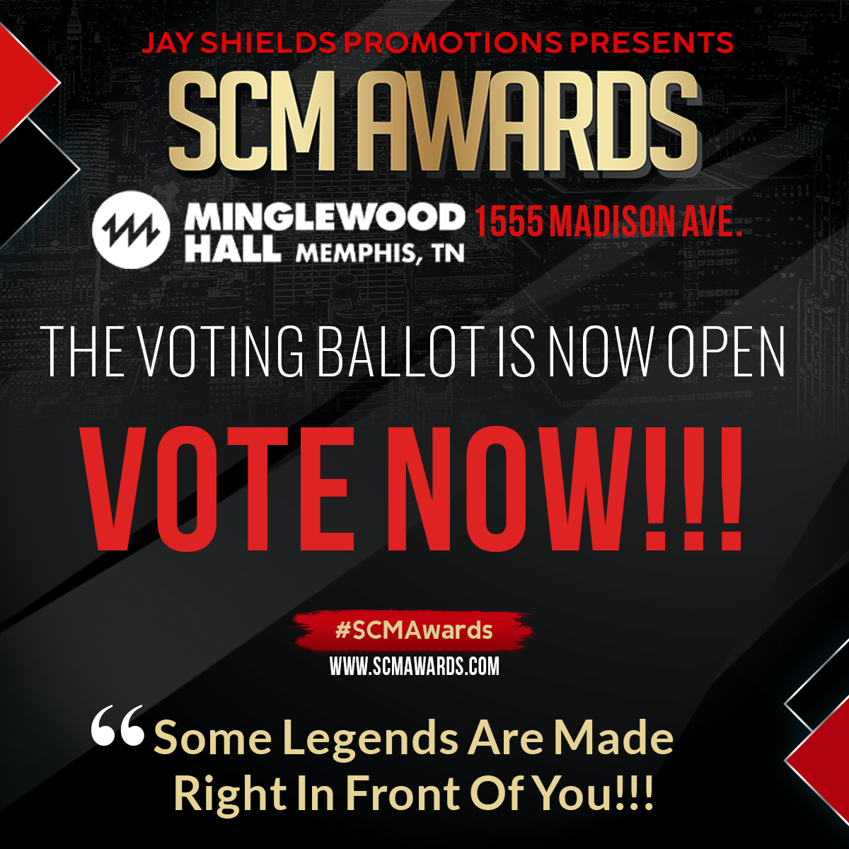 The SCM Awards is an annual celebration created to honor the visionaries, trailblazers, and dedicated talents shaping the culture of Hip-Hop and R&B. Founded and produced in Memphis, TN, the ceremony recognizes the outstanding achievements of underground, independent, and major artists, as well as the DJs, producers, record labels, videographers, entrepreneurs, models, graphic designers, tattoo artists, and countless other creatives who keep the industry moving forward.
